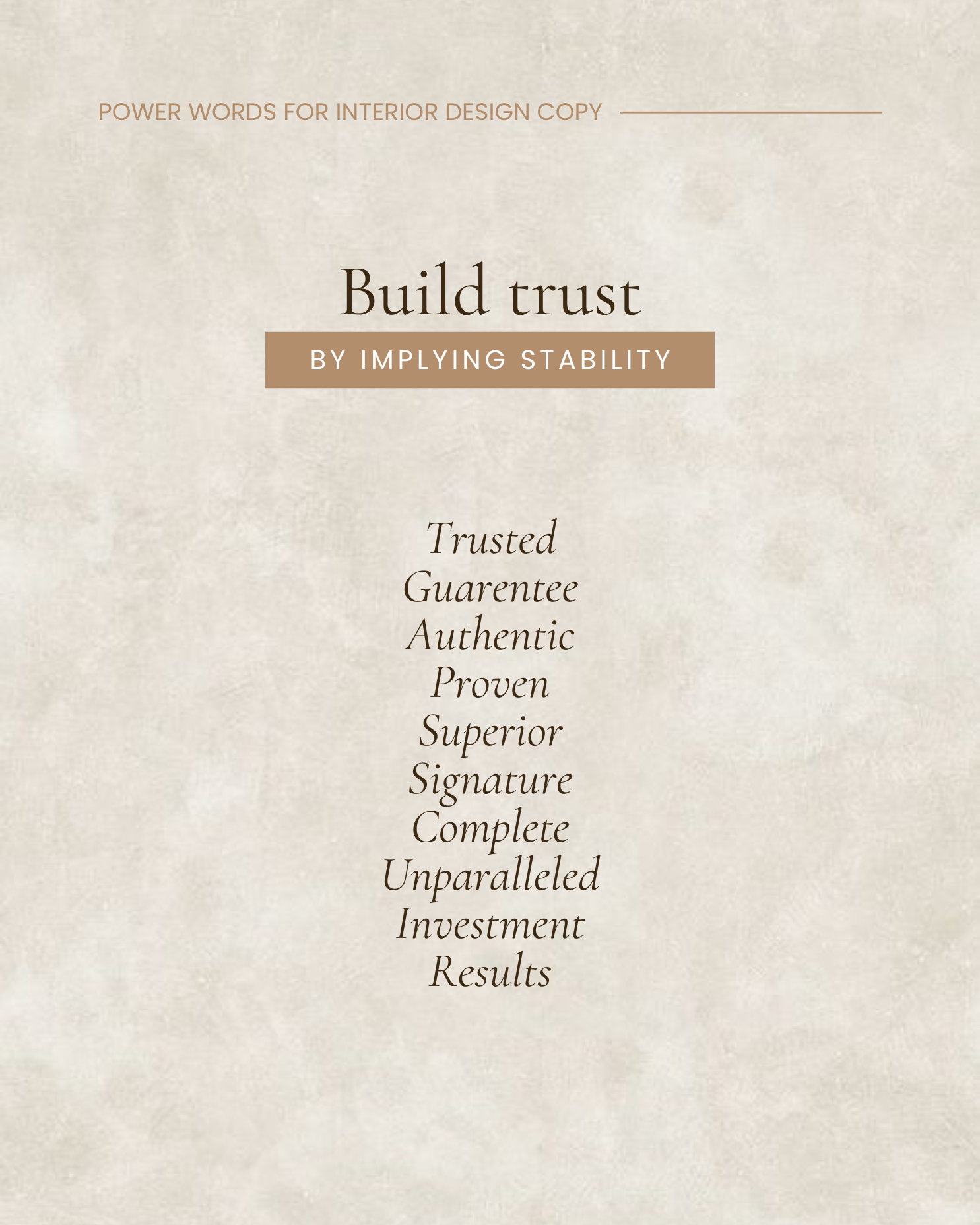 If you want to build trust with your audience, you need to offer stability. That can be implied with words such as Trusted, Guarenteed, Authentic, Proven, Superior, Signature, Complete, Unparalleled, Investment, Results.