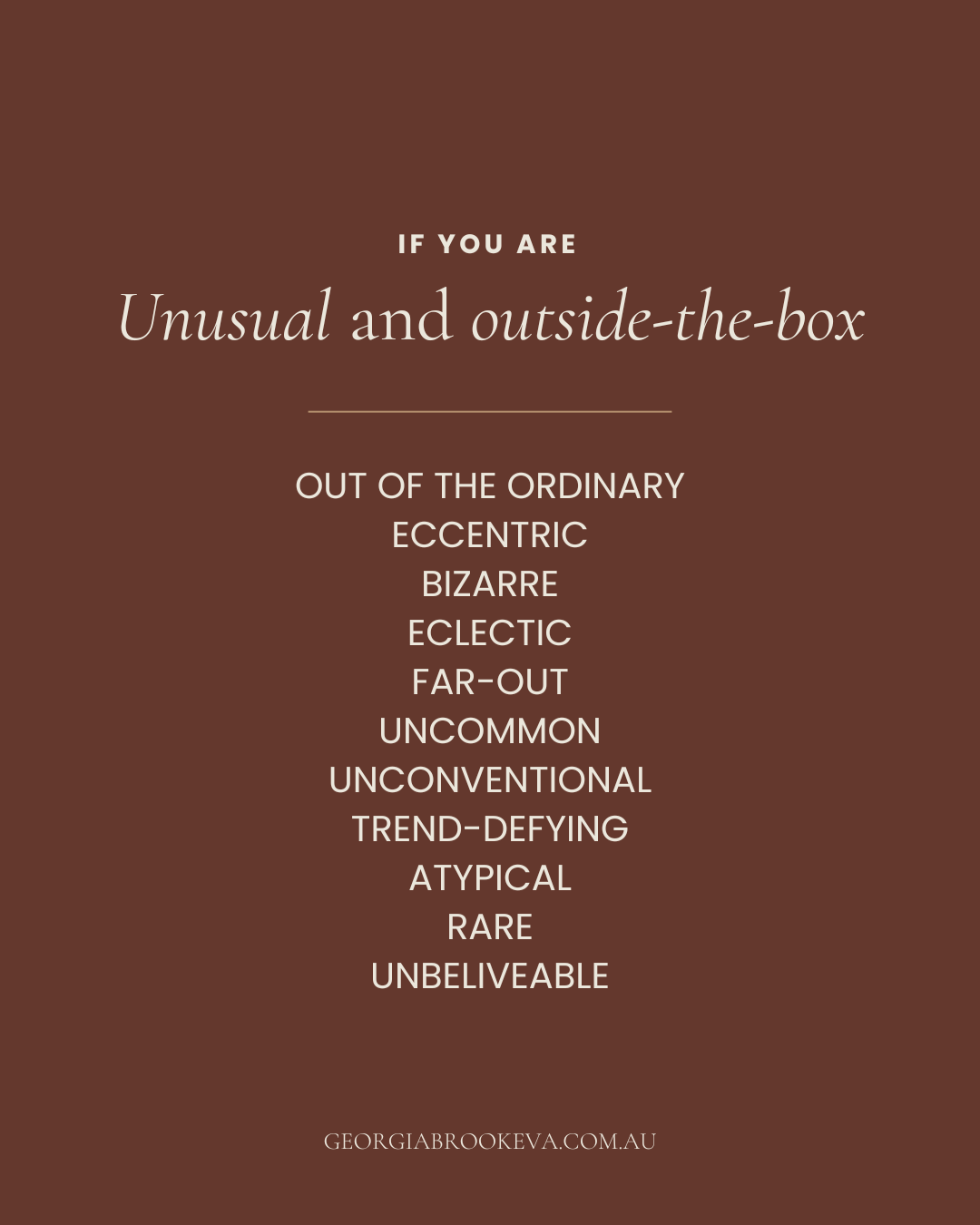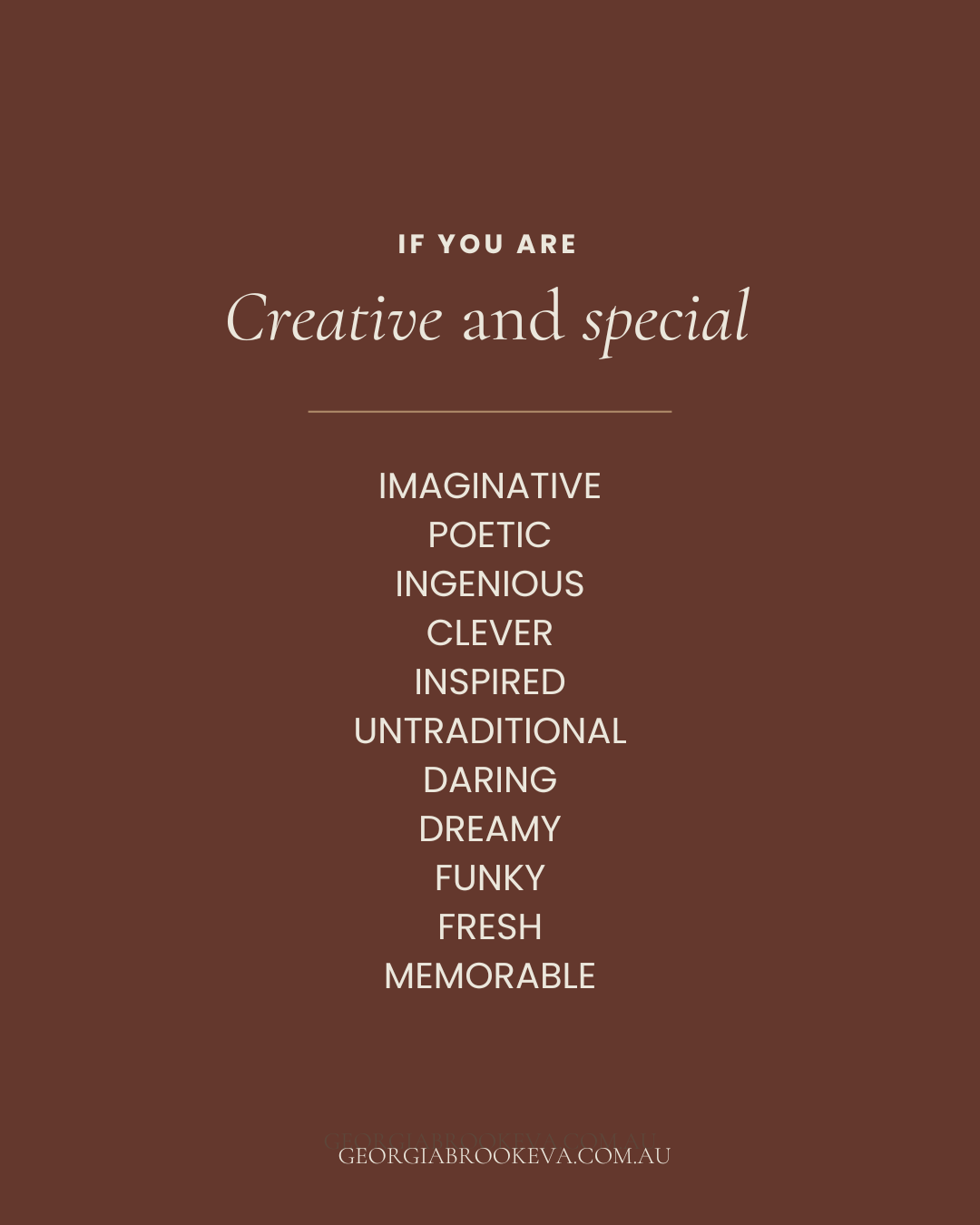 If you attract interior design clients that crave Creative and Special, these words will define your brand: Imaginative, Poetic, Ingenious, Clever, Inspired, Untraditional, Daring, Dreamy, Funky, Fresh, Memorable.