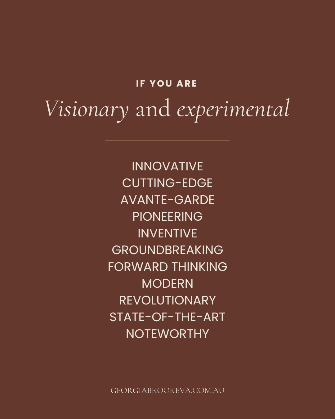 If your interior design studio is Visionary and Experimental, try out these words: Innovative, Cutting-edge, Avante-garde, Pioneering, Inventive, Groundbreaking, Forward thinking, Contemporary, Revolutionary, State-of-the-art, Noteworthy.